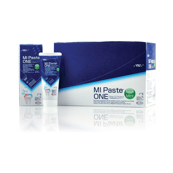 Mi Paste One Anti-Cavity Toothpaste, Fresh Mint is a 2-n-1 application (toothpaste and MI Paste Plus) that contains Recaldent ™ (CPP-ACP) and fluoride, in a cool mint flavor. This product presents another way to treat sensitivity, remineralize tooth enamel and prevent white spot lesions. Imagine a simple, single step for treatment and cleaning. As a replacement for your current toothpaste, it gives you the same power of MI Paste Plus®, but in a single application. Now, rather than brushing first then applying MI Paste® and/or MI Paste Plus, you’ll simply brush with MI Paste ONE.